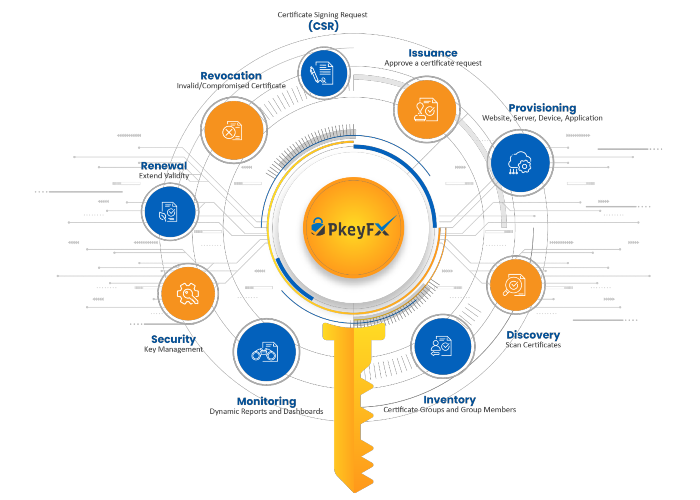 PkeyFx is a comprehensive Certificate Lifecycle Management solution designed to streamline, simplify and automate the management of digital certificates, ensuring enhanced trust and security, regulatory compliance, and operational efficiency for organizations of all sizes.