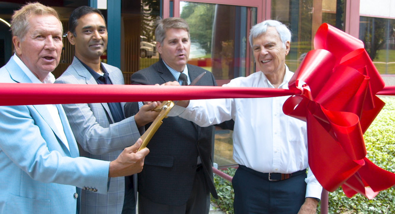 Ribbon Cutting Ceremony (From left to right)- Former Governor of Ohio, John Richard Kasich Jr., CEO of ISSQUARED Bala Ramaiah, Mayor of Chardon Christopher Grau, Ret. Admiral Bill Owens, US Navy, Former Vice-Chairman of the Joint Chiefs of Staff